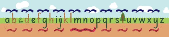 L’abécédaire Entre les lignes facilite la compréhension du lignage d’écriture sol-gazon-ciel en associant les lettres de l’alphabet à des plantes. Ainsi, les apprenants peuvent nommer explicitement les lignes — celle des oiseaux, celle du gazon, celles du sol et des vers de terre — lors du traçage des lettres, qui peut presque s’apparenter à une verbalisation théâtrale, un élève de première année nous explique cette approche de la façon suivante : : « je place la lettre r sur le gazon, la lettre k qui monte jusqu’à la ligne des oiseaux, et la lettre j qui descend jusqu'à la ligne des vers de terre... yarck, les vers de terre ! »